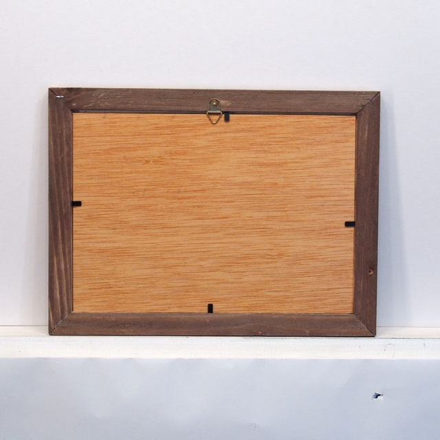 Marco artesanal listón pino tintado y fondo tela negra 21x28 exterior. A punto de colgar o dejar en tu estante.