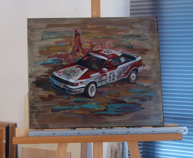 Pintura original en acrílicos sobre lienzo de 46x55, que representa a Carlos Sainz con el Toyota Gt Four que le dió el primer título mundial.