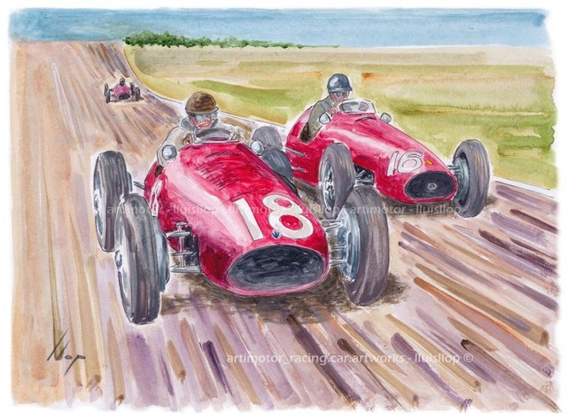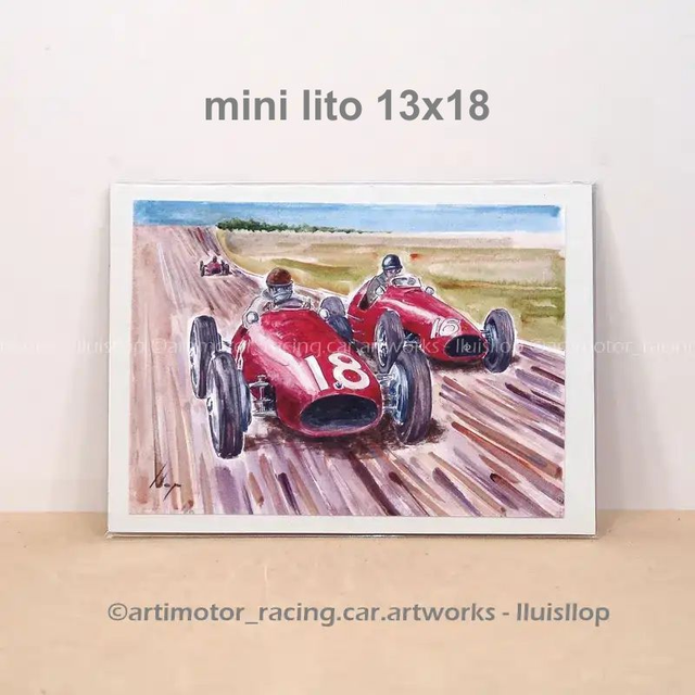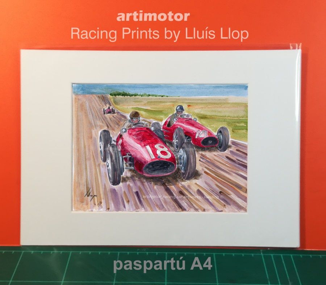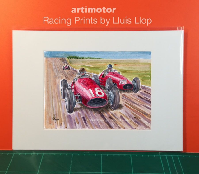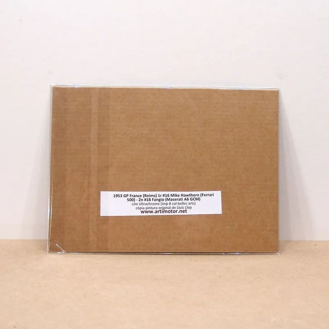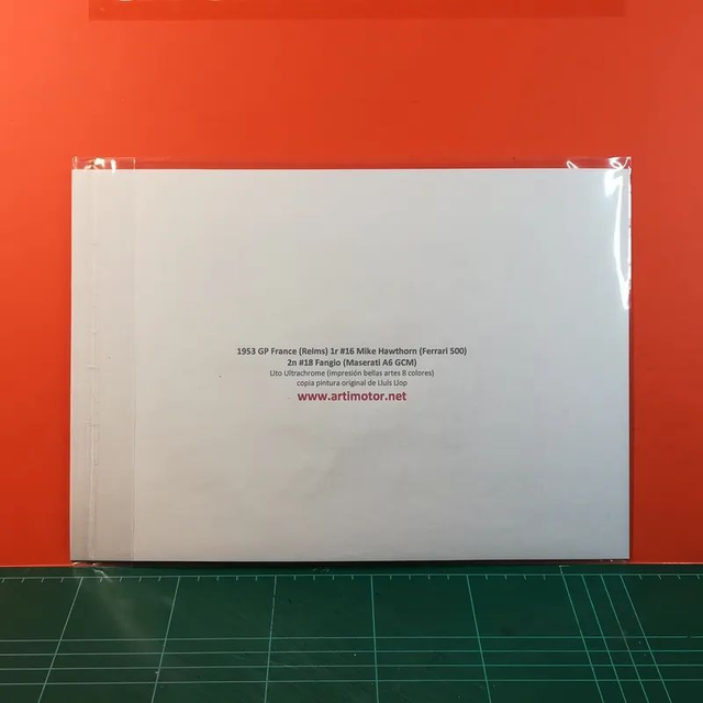 Fangio con el Maserati A6 por delante de Hawtorn Ferrari 500. Gran premio de Francia en Reims 1953. Impresión en papel especial 160gr, presentada en cartón microcanal y dentro de bolsa de polipropileno cristal (puedes dejarla vertical en tu estantería o vitrina). Dos medidas de la lito 13×18cm y paspartú A4. Diversos modelos de autos de carrera y rally.
