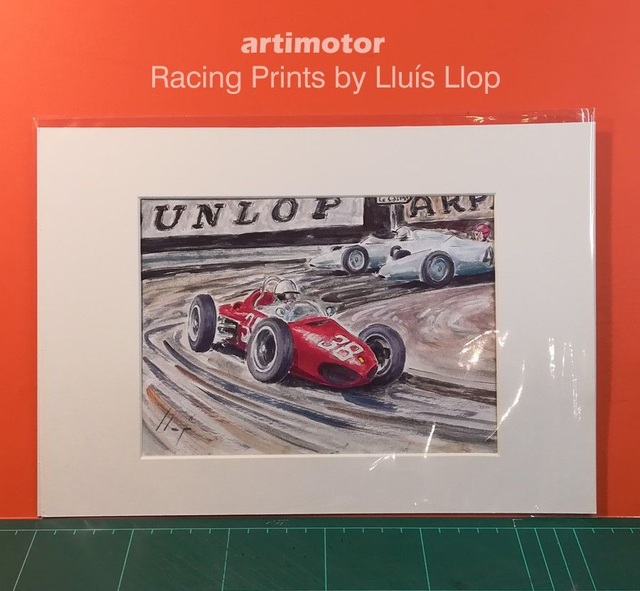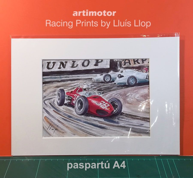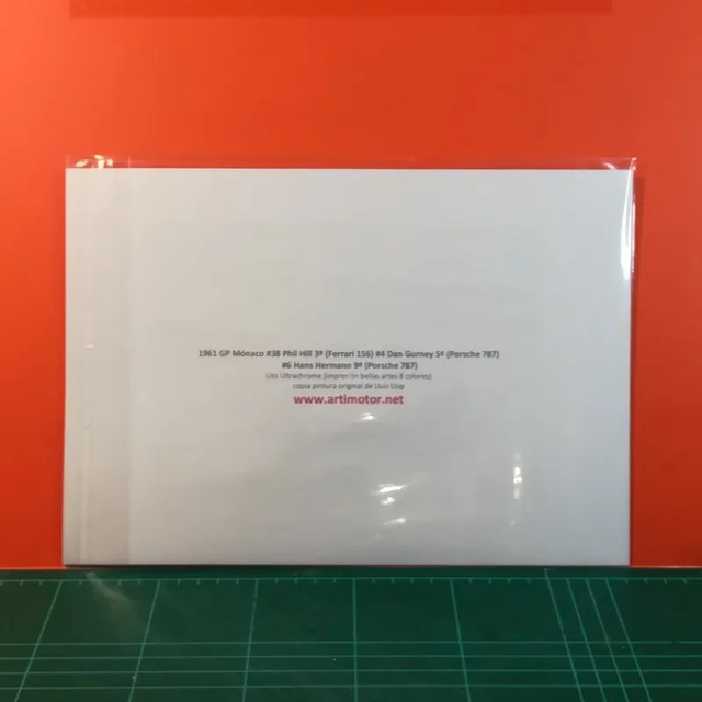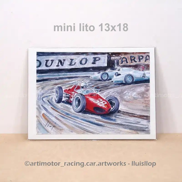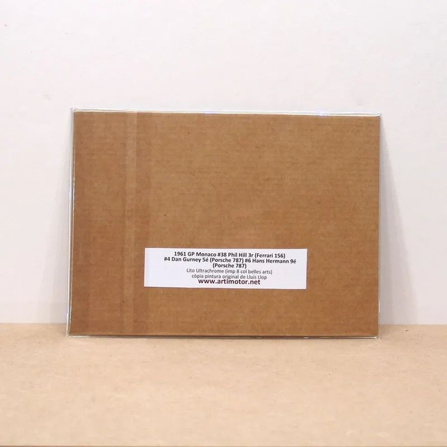 Phill Hill con el Ferrari 156, 3º en el G.P. Mónaco 1961. Impresión en papel especial de 160gr, presentada en cartón microcanal y dentro de bolsa de polipropileno cristal (puedes dejarla vertical en tu estantería o vitrina). Dos medidas de la lito 13×18cm y paspartú A4. Diversos modelos de autos de carrera y rally.