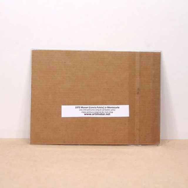 1972 Lancia Fulvia con Sandro Munari, ganadores del Rallye Montecarlo. Impresión en papel especial 13x18 de 160gr, presentada en cartón microcanal y dentro de bolsa de polipropileno cristal (puedes dejarla vertical en tu estantería o vitrina). Medida de la lito 13×18cm. Diversos modelos de autos de carrera y rally.